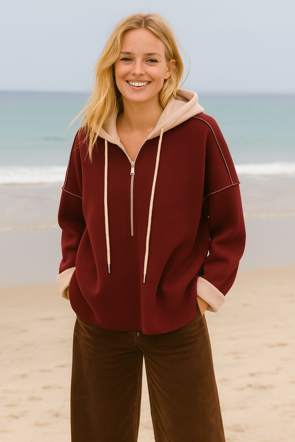 Effortlessly casual yet polished, crafted in a medium-to-thick weight Italian knit that drapes beautifully while keeping you cosy. Designed with a relaxed fit, it features soft contrast cuffs and hood lining in beige, a front zip fastening, and discreet side pockets for laid-back practicality.